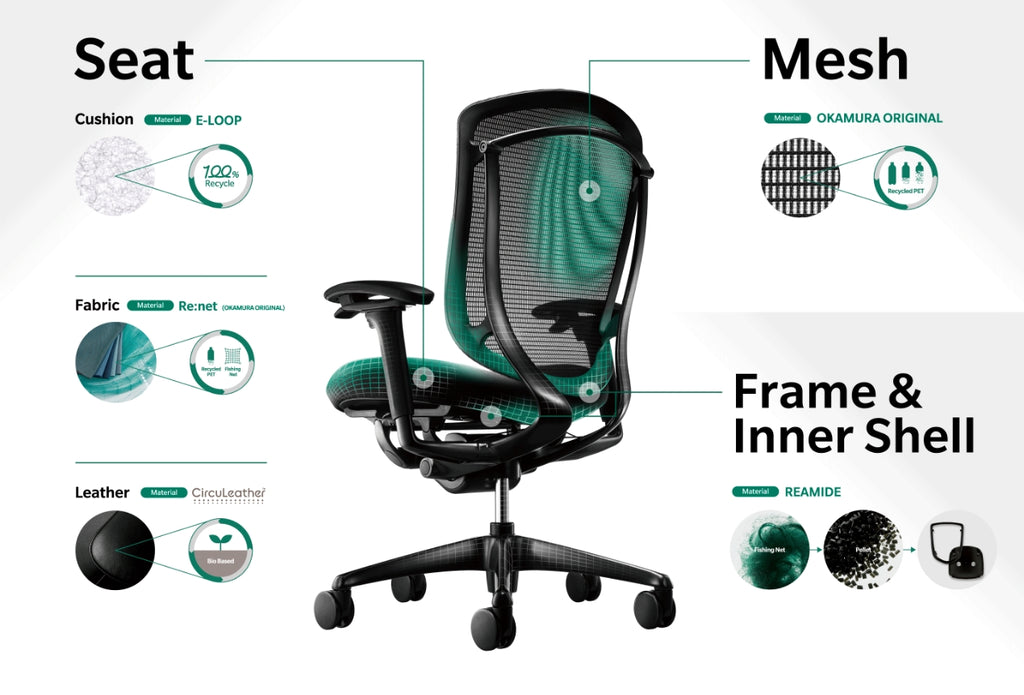 オカムラのフラッグシップモデルであるコンテッサセコンダ。2022年に「コンテッサ」シリーズとして発表から20周年の節目を迎えた今、より永く、より多くの世代の人に愛され続けるために、環境配慮型素材を主要部品に採用したサーキュラーモデルが仲間入りしました。