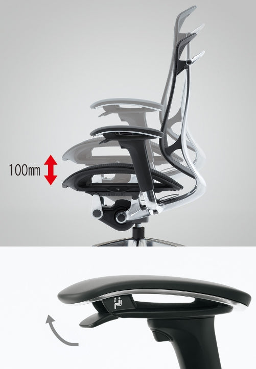 右肘の操作レバーにより、座面の高さ調節が行なえます。(ストローク:100mm)