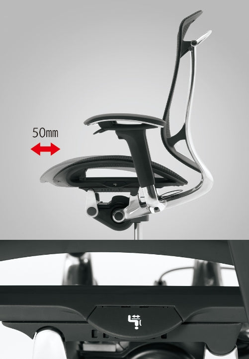 また、座面下両側にあるレバーの操作により、座面の前後調節が行えます。(ストローク:50mm)