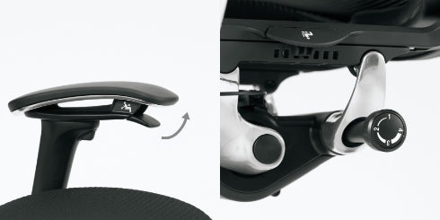 肘の先端にレバーを付けることで、座ったままの自然な姿勢で基本的な調整が簡単に行えます。