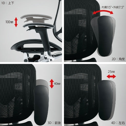 これまでの肘パッド部の上下(1D)、角度(2D)、前後(3D)の動きに加え、左右方向(4D)の調節が可能です。上下は100mm、角度は内側15°、外側7.5°、前後は40mm、左右は片側25mmずつ可動します。