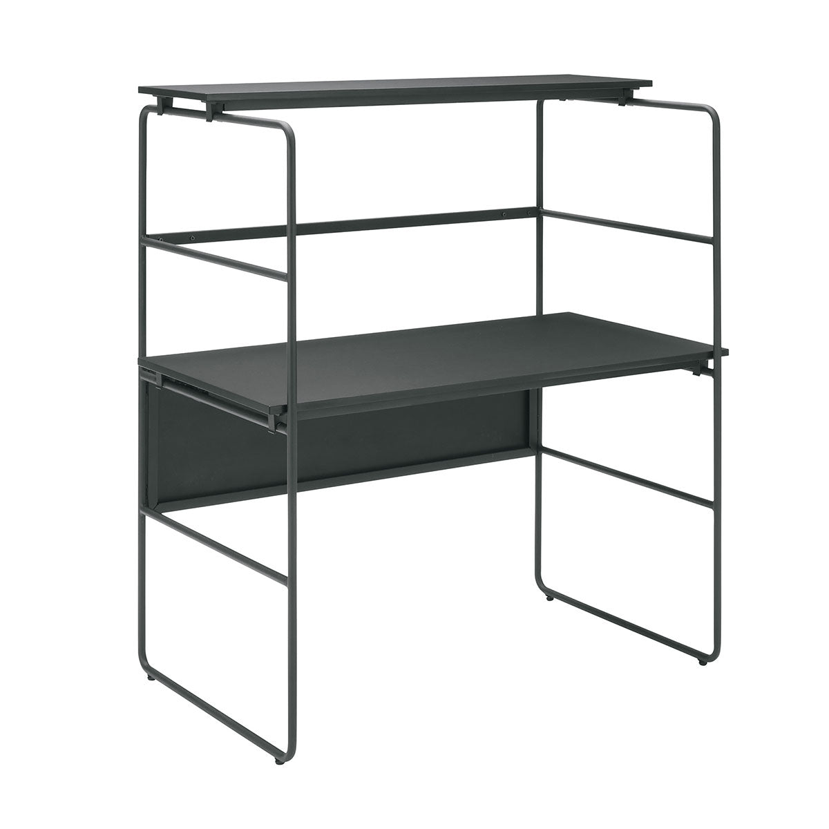 ①デスクセット:天板と棚板の高さを変えることでデスクとハイデスクにで切り替えが可能。フレームによって仕切られる一人用ワークスペース。