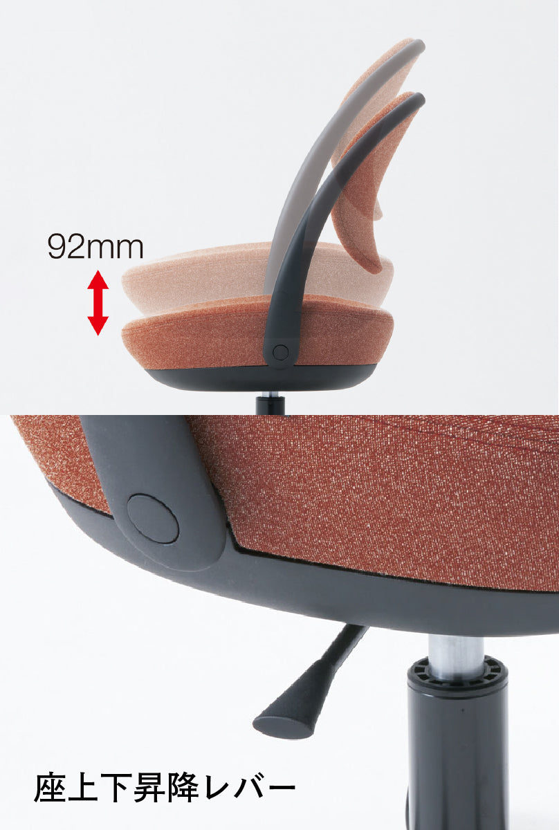 面の右下にあるレバーを持ち上げることで、座面の高さ調節が可能です。(ストローク:92mm)