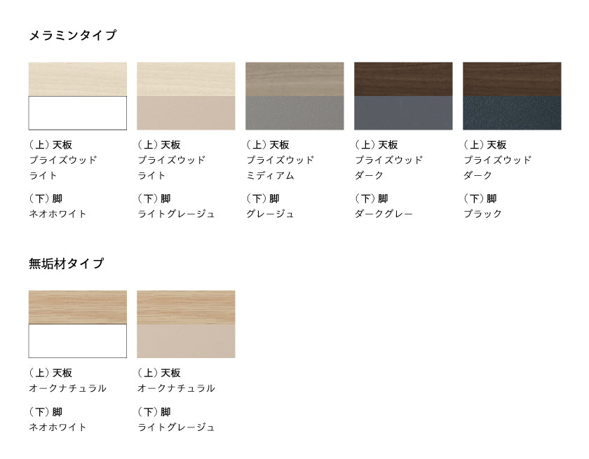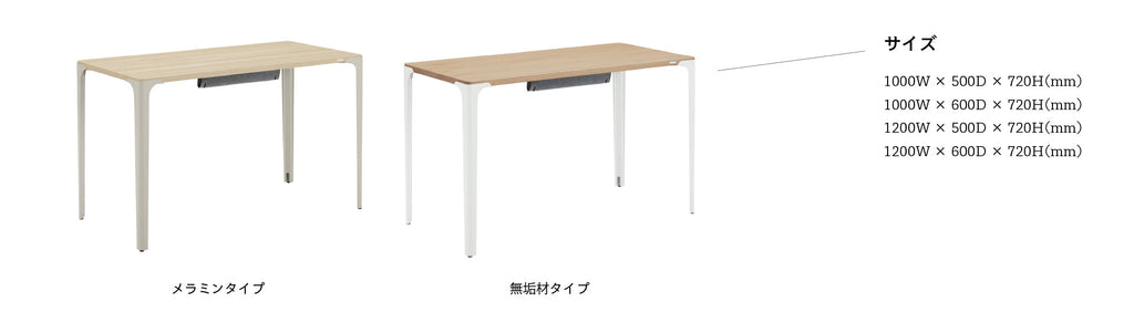 メンテナンスしやすい丈夫なメラミン化粧板と天然木の温かい肌触りが心地よい無垢材、2種類の天板を揃えています。
