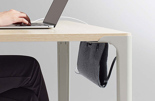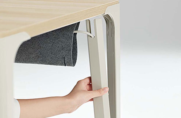 乱雑になりがちなコード類も脚に沿わせてすっきり収納。フェルト製の配線受けはレイアウトに合わせてデスクの奥か横に取り付けることができるため、⾜元が広く使えます。