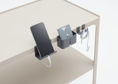 シェルフ上段には、小物の収納に便利なフック×2、スマホスタンド、ポケットを取り付け出来ます。