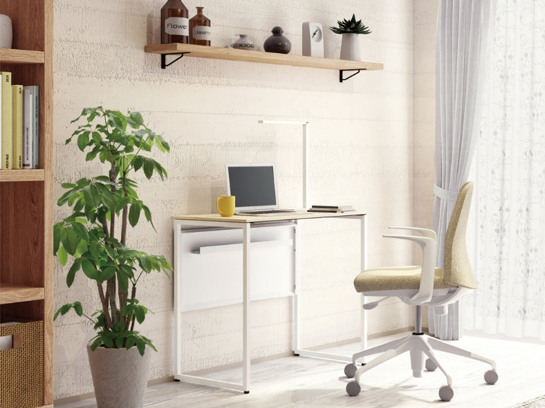 パソコンなどの余長ケーブルを整理できる機能を備えた、在宅ワーク向けのスタンダードなデスク。薄い天板や細いフレーム脚による軽やかでシンプルなデザインで、部屋のインテリアに自然に溶けこみます。