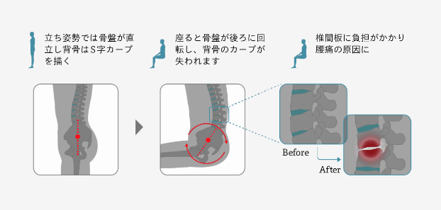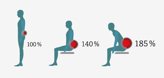 じつは、座る姿勢は腰に負担がかかるのです。立っているときに腰椎(ようつい)の椎間板(ついかんばん)にかかる負担を100%とすると、座った姿勢で140%、さらに身体を前にかがめた前のめり姿勢では185%の負担がかかるといわれています。