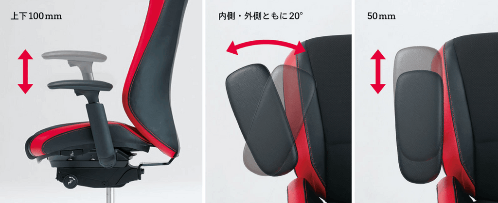 肘パッド裏にあるボタンを押すことで、高さ調節が可能(ストローク:100mm)。また、肘パッドは前後に50°、内側に20°、外側に20°動かすことができます。