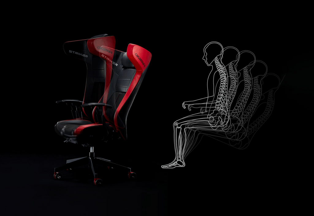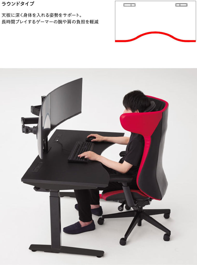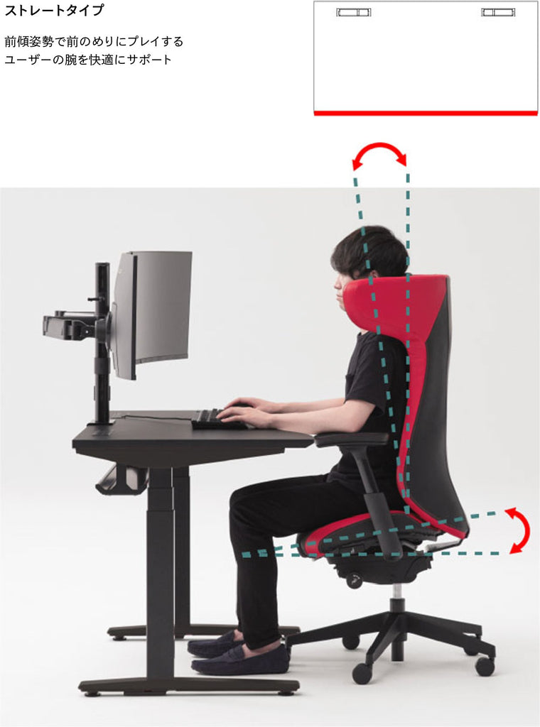 より深く集中したい時や、素早い操作が求められるプレイ時には、前傾姿勢が効果的です。「腹部の圧迫の解消」、「骨盤が起きて、背骨のS字が保たれることによる腰の負担軽減」などのメリットがもたらされます。