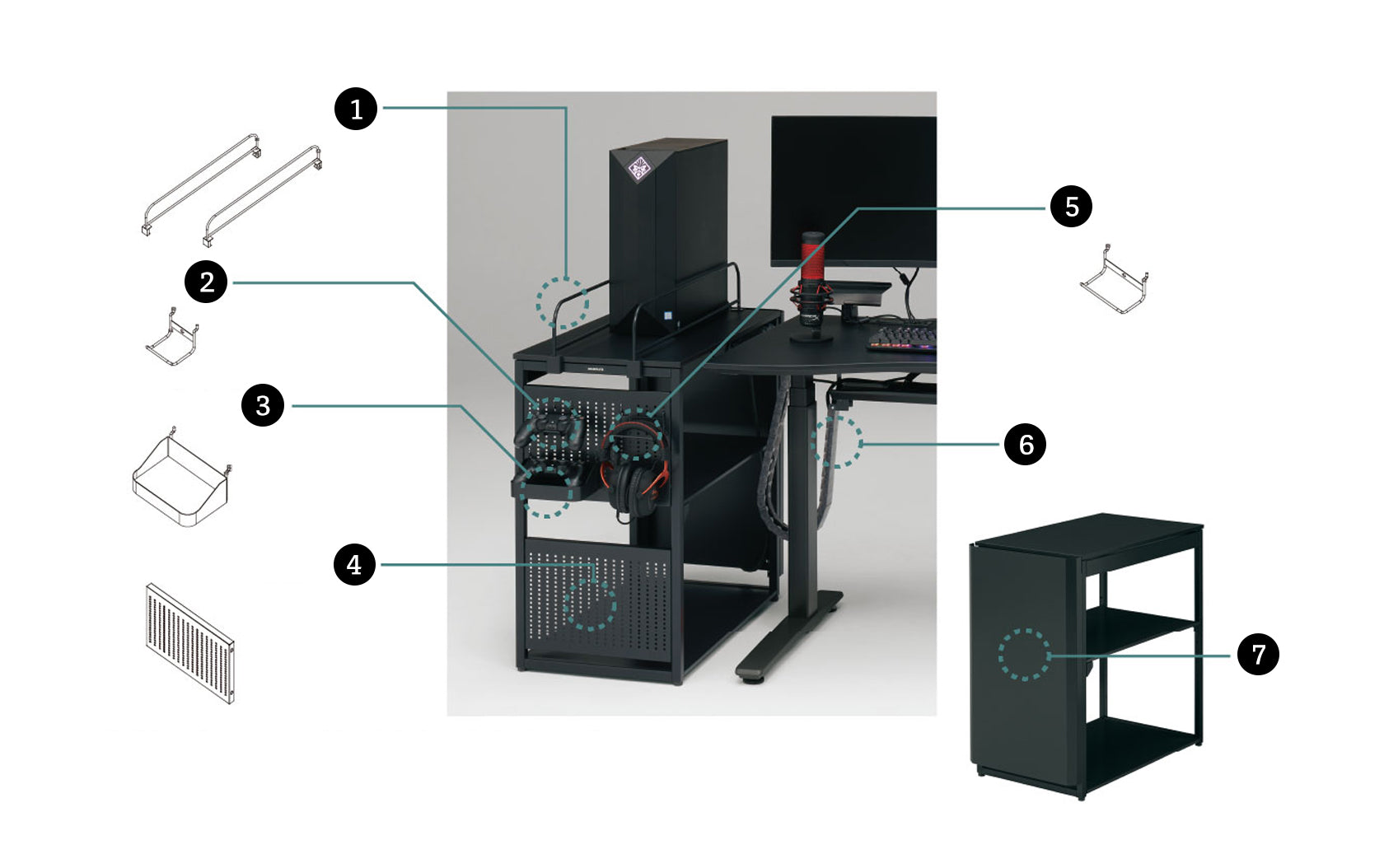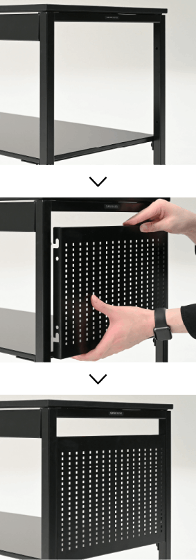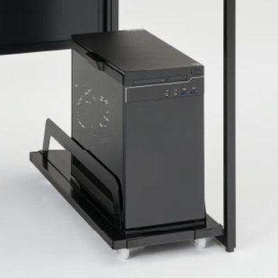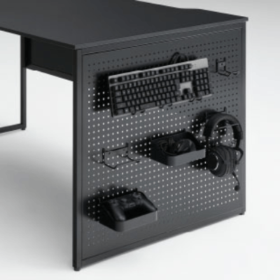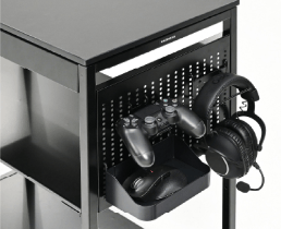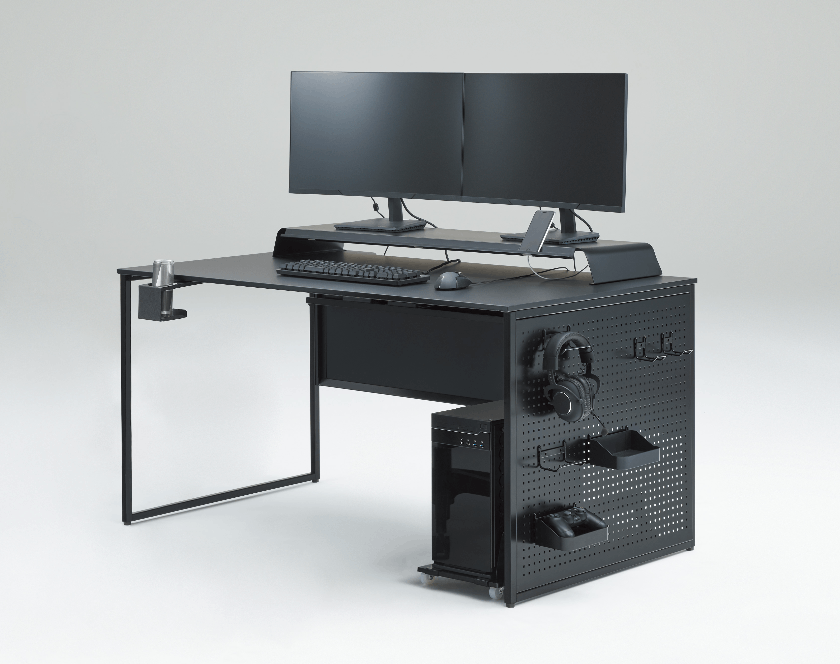 オプション取付幕板を用いることで、各種フックを側面に加えることが可能です。コントローラやヘッドホンなどの周辺機器を自由度高くレイアウトすることができます。他にも、ゲーム機やゲーミングPCの設置を想定した、背面の配線カバー幕板や様々なPCサイズに対応可能な転倒防止用フレームもございます。